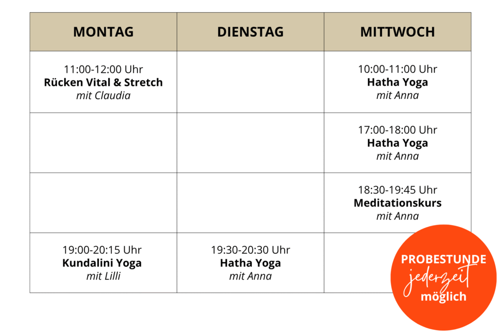 - montags 19:00-20:15 Uhr Kundalini Yoga mit Lilli